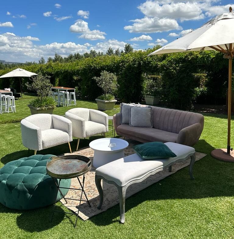 1 x Mauve Couch 2 x Camilla Tub Chairs 1 x French Bench 1 x Green Button Ottoman 1 x Sumo Coffee Table White 2 x Side Tables 1 x Rust/Natural Carpet Scatter Cushions